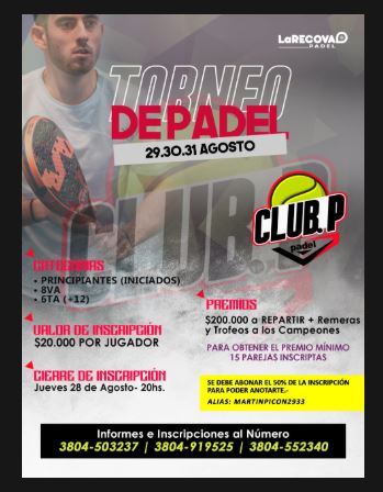 Los días 29, 30 y 31 de agosto se disputará un nuevo torneo de Pádel, con importantes premios en efectivo. Tienen tiempo de anotarse hasta el 28 de agosto.